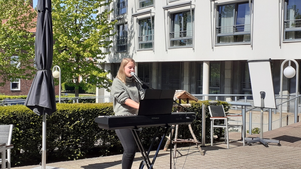Am 14.05.2020 fand bereits unser 8. Terrassenkonzert statt. Katharina Brinkmann spielte mit Ihrem E- Piano bekannte Frühlingslieder und lud alle Bewohner zum Mitsingen ein. Auch einige Pop- Klassiker wie "Amazing Grace" oder "Imagine" durften nicht fehlen. Herzlichen Dank für die stimmungsvolle Abwechslung.