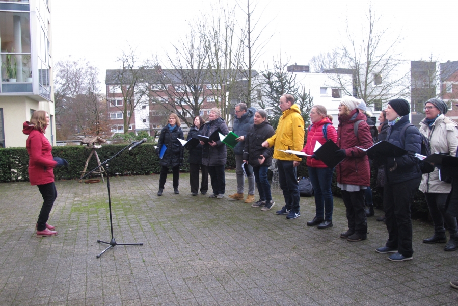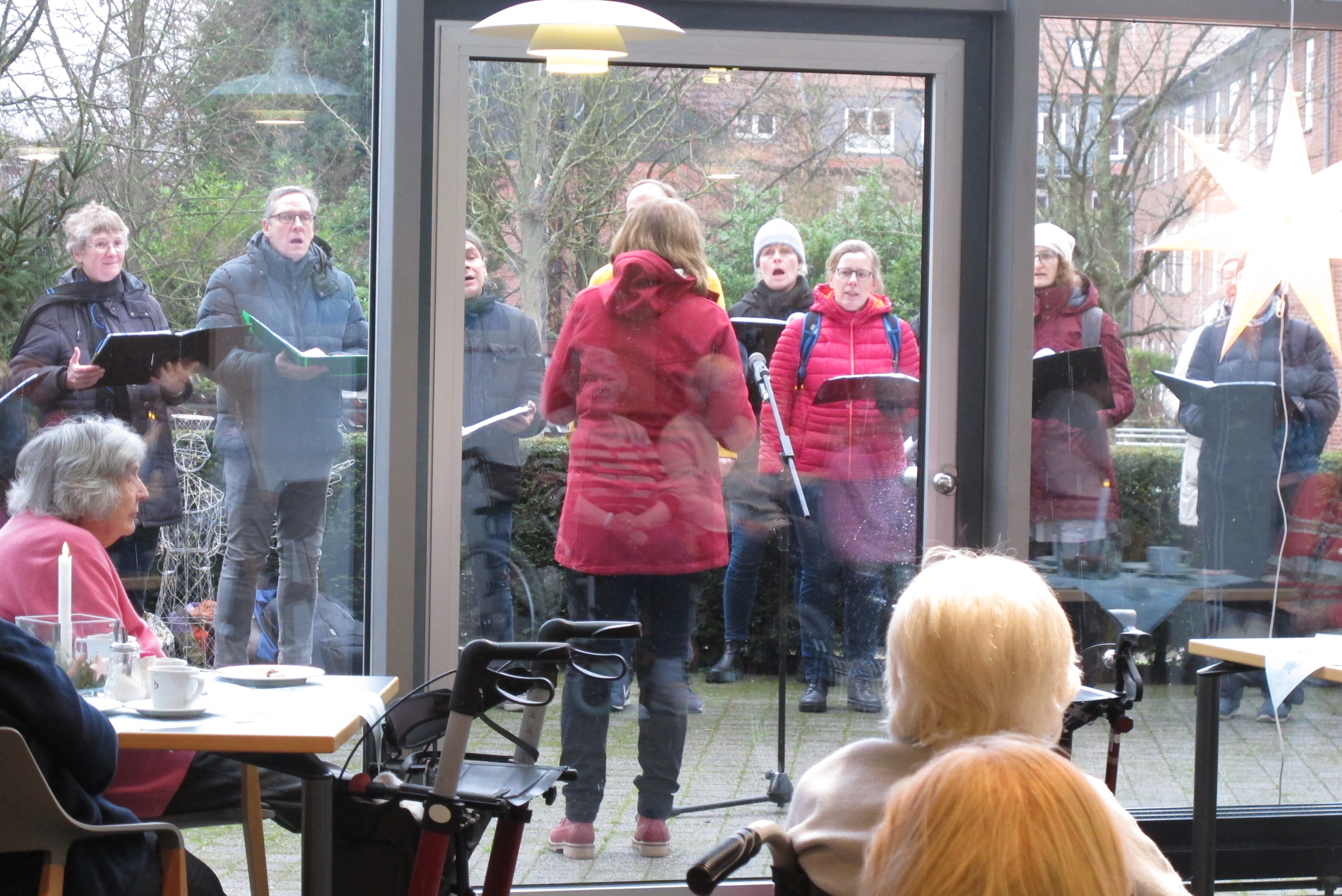 Der Chor "Blue Notes" aus der Kirchengemeinde Heilig Geist beschenkte die Bewohner am 4. Advent mit einem Terrassenkonzert. Die BewohnerInnen konnten im Cafe, in den Zimmern und den Wintergärten den weihnachtlichen Melodien lauschen.