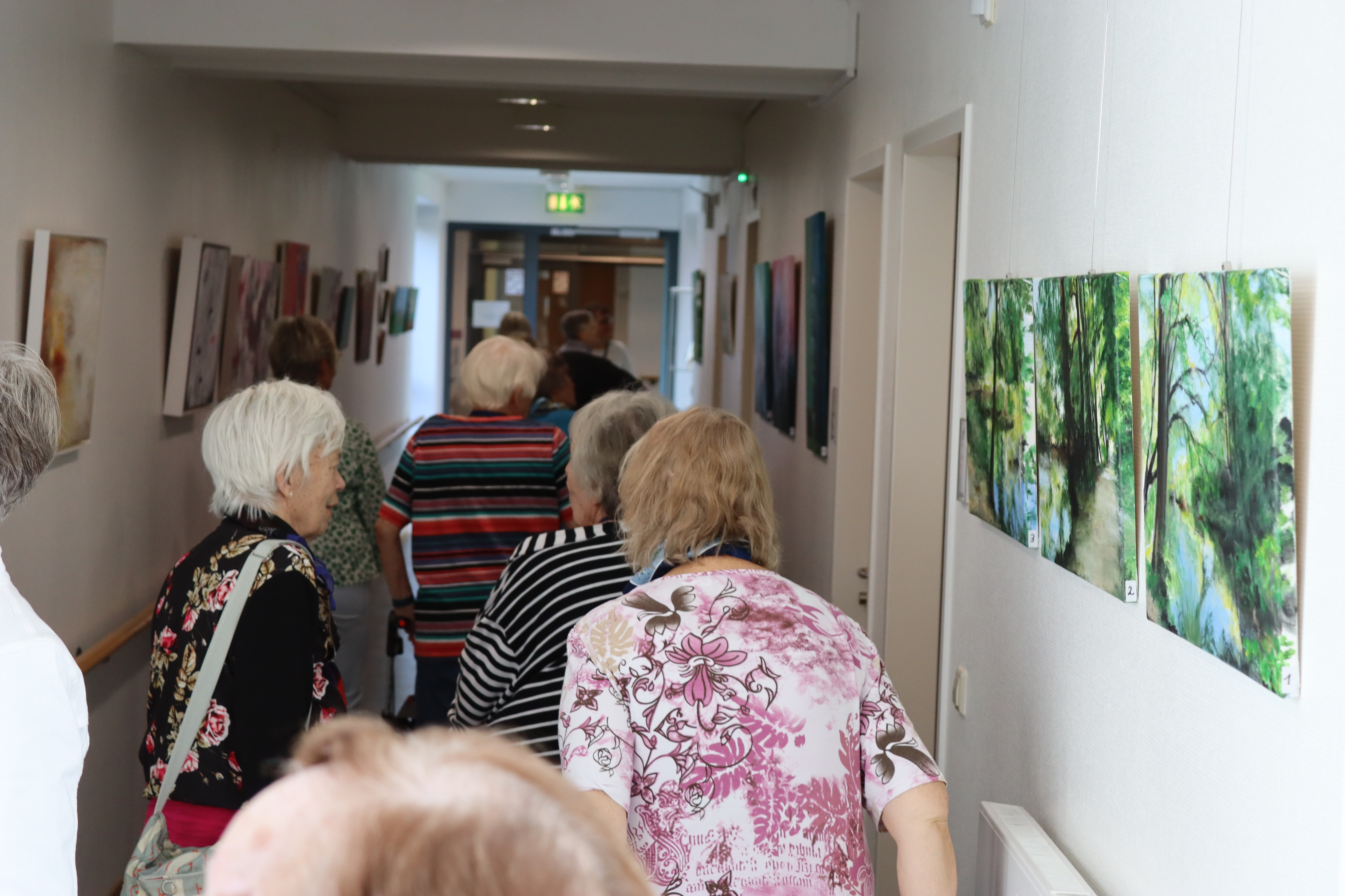 Mit großer Freude durften wir die Ausstellung „Gemalte Augen-Blicke“ in unserem Altenheim eröffnen. Acht Künstlerinnen und Künstler präsentierten Werke, die im Atelier „über Grün“  in verschiedenen Malkursen entstanden sind. Bei der feierlichen Eröffnung berichteten sie unseren Bewohnerinnen von ihren Lieblingsmotiven und der Bedeutung, die das Malen für sie hat. Die persönlichen Einblicke fanden großen Anklang, und beim gemeinsamen Anstoßen mit einem Glas Sekt kam schnell eine heitere Stimmung auf. Im Anschluss nutzten viele die Gelegenheit, die Kunstwerke in Ruhe zu betrachten und mit den Kunstschaffenden ins Gespräch zu kommen. Wir danken allen Beteiligten für diesen besonderen Nachmittag voller Farbe und Inspiration.