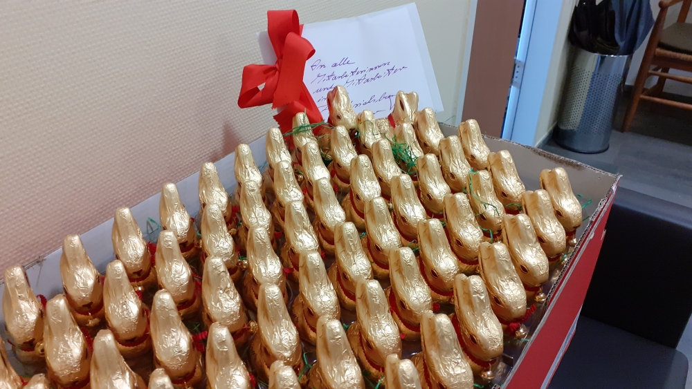Ein Angehöriger schickte für alle Mitarbeiter den Osterhasen in Schokoladenform vorbei. Die kleine Aufmerksamkeit erfreute vor allem die Kollegen, die an den Feiertagen Dienst taten.