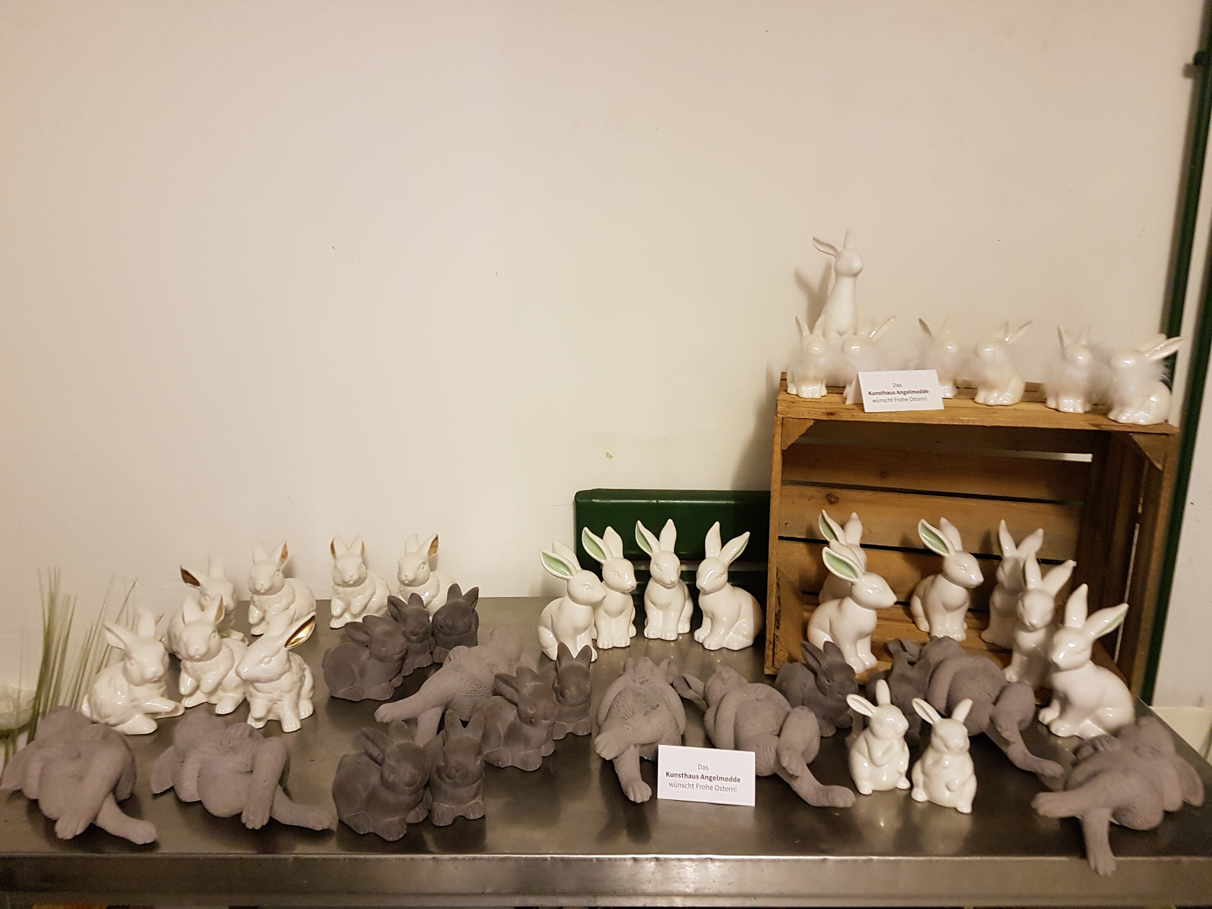 Hinzu kamen 50 Keramikhasen und eine große dekorative Schale, die wir vom Kunsthaus Angelmodde geschenkt bekamen.