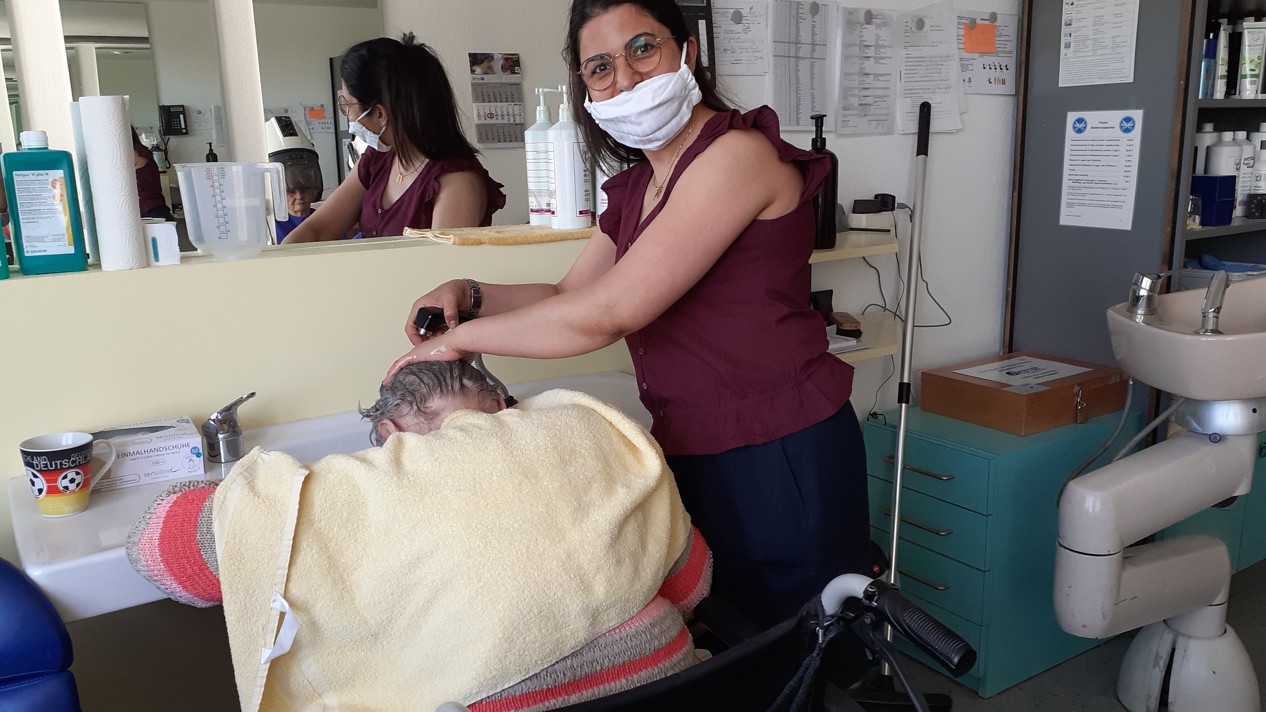Zum Glück ist eine unserer Pflegerinnen gelernte Frisörin. Ihr Geschick mit Schere und Lockenwicklern sorgte bei vielen Bewohnern für ein glückliches Lächeln.