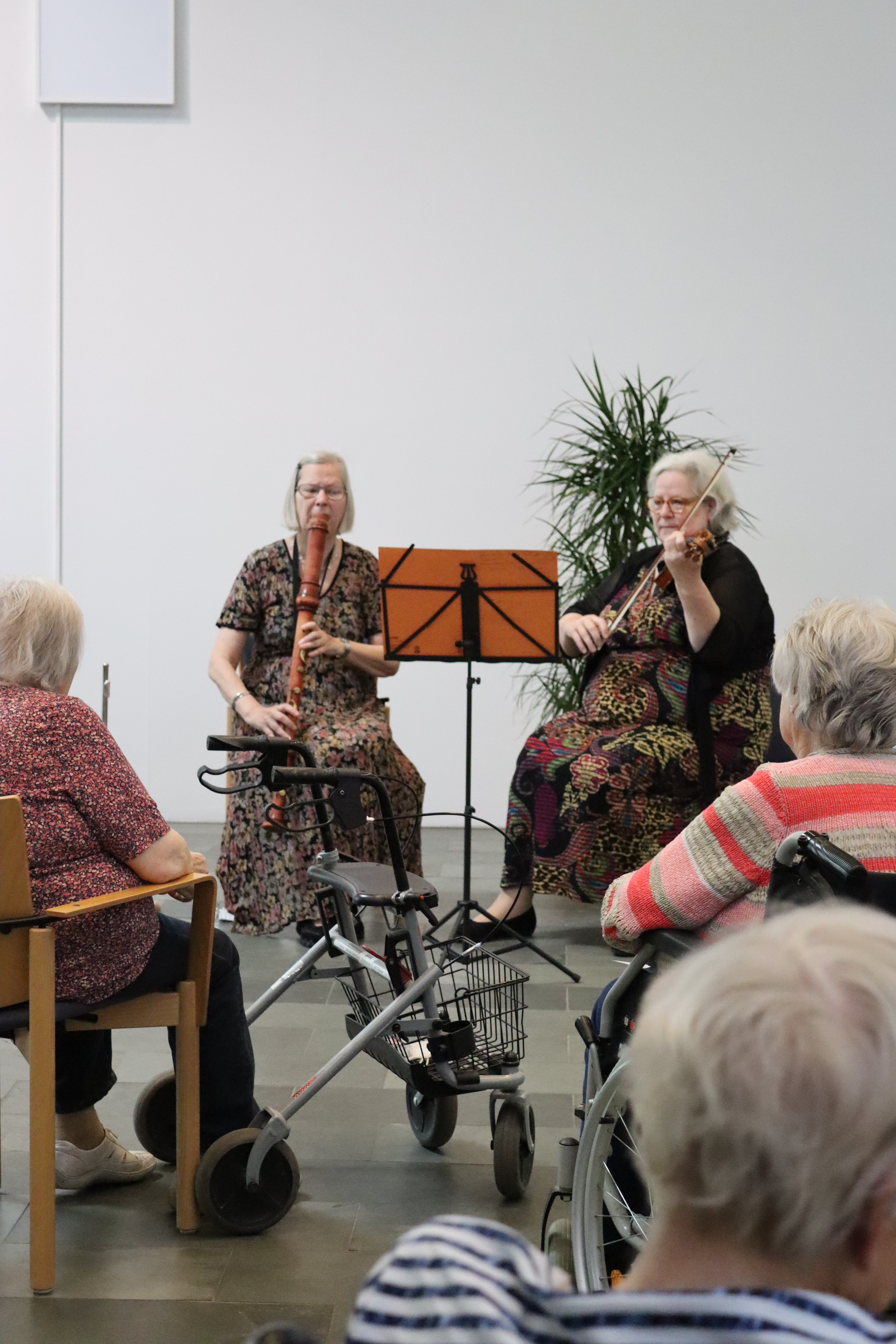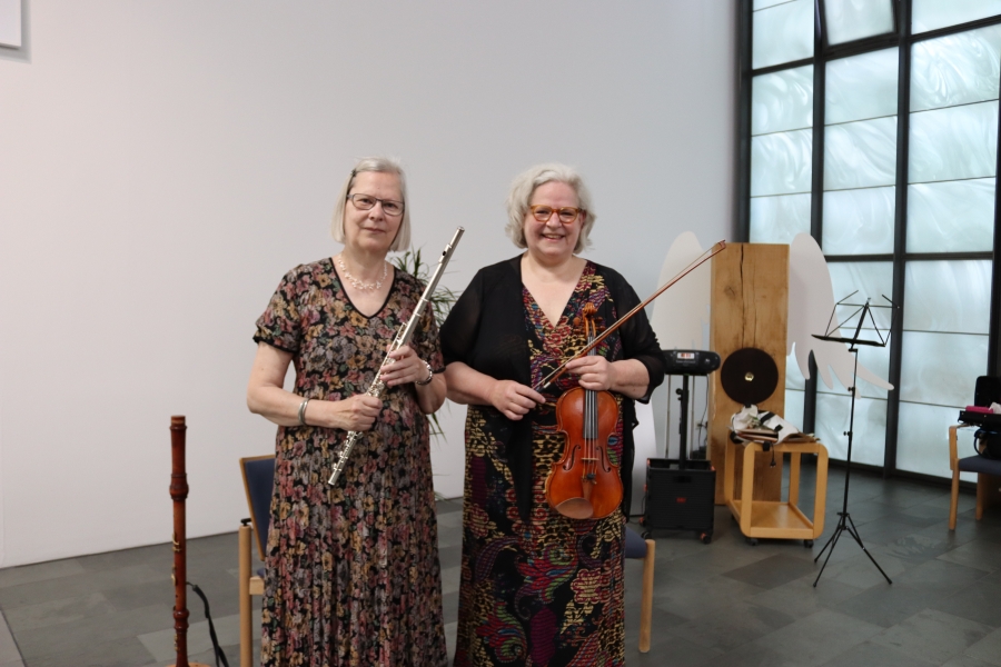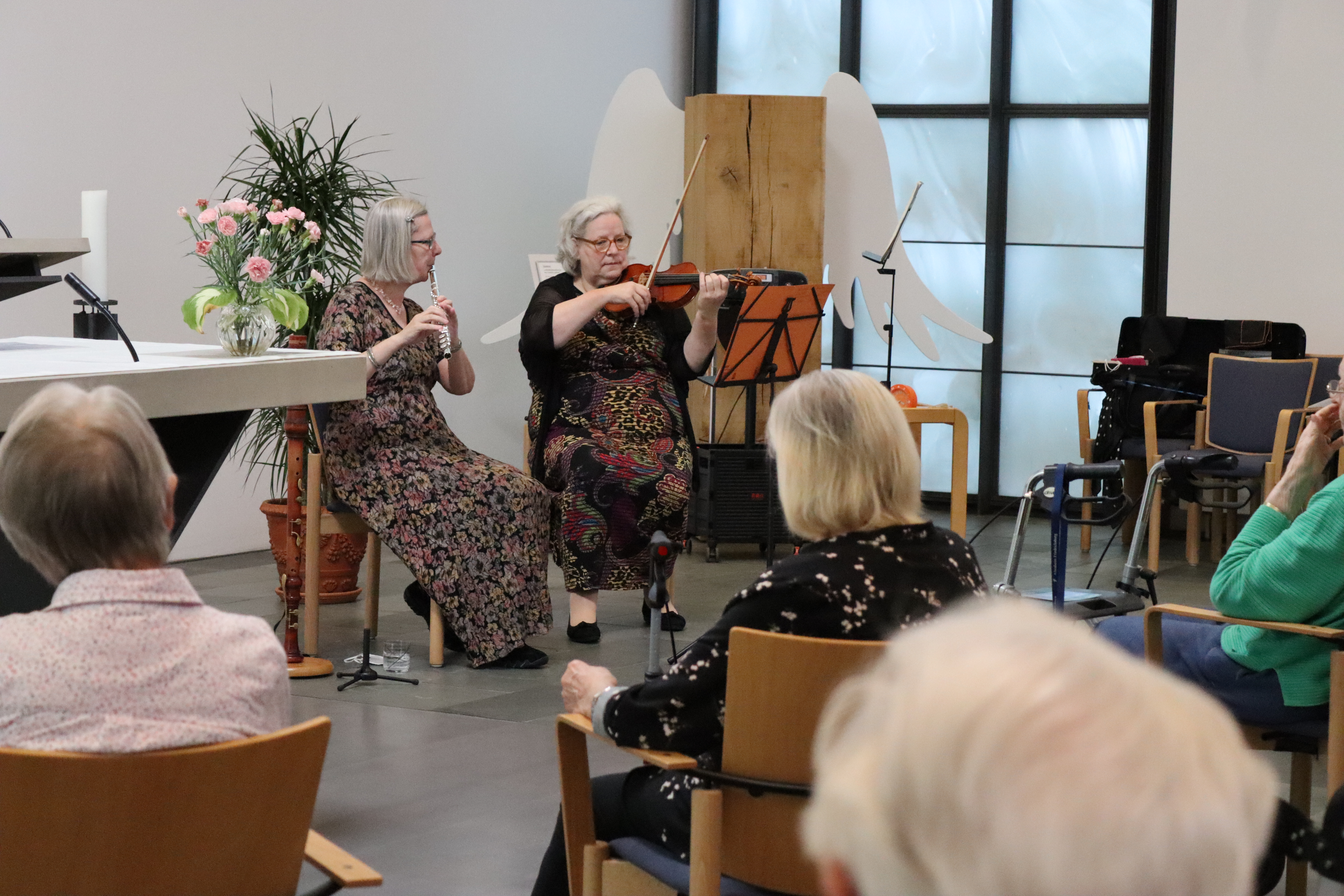 Angelika und Elisabeth Budde erfreuten uns am 11.05.2022 in der gut besuchten Kapelle mit klassischen Stücken für Violine und Flöte. Sie brachten bekannte Melodien zu Gehör, unter anderem von Wolfgang Amadeus Mozart, Ludwig van Beethoven und Franz Schubert. Angelika Budde ergänzte das musikalische Programm mit kurzweiligen Anekdoten zu den Komponisten und forderte die BesucherInnen auf einige Frühlingslieder mit zu singen. Zum Abschluß gaben die Musikerinnen einige Strauß Walzer zum besten, bei denen es die BesucherInnen nicht mehr auf den Plätzen hielt: Es wurde getanzt. Ein gelungenes Konzert!