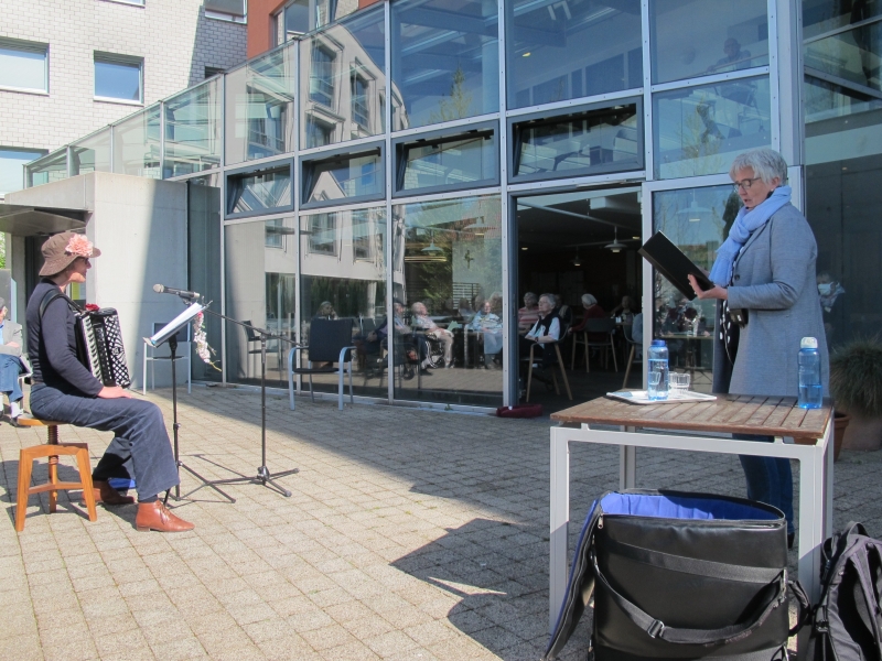 Bei schönstem Sonnenschein besuchten uns gestern Frau Bockhaus-Odenthal und Frau und Steigenberger auf unserer Terasse. Begleitet von Akkordeonklängen sangen sie mit uns bekannte Frühlingslieder.
