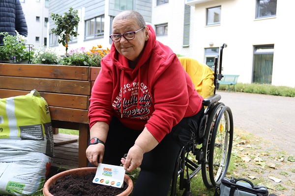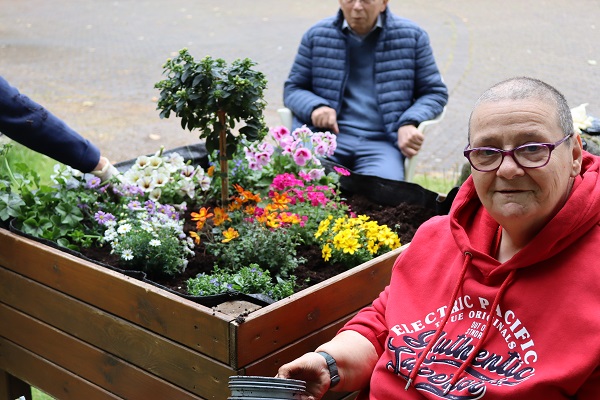 Während das Wetter mit Wolken und Wind eher herbstlich anmutet, lassen wir in unseren Hochbeeten und Blumenkübeln den Frühling einziehen. Gemeinsam mit Mitarbeiter*innen des Sozialen Dienstes pflanzten Bewohner*innen Geranien, Männertreu und zahlreiche Kräuter ein.
