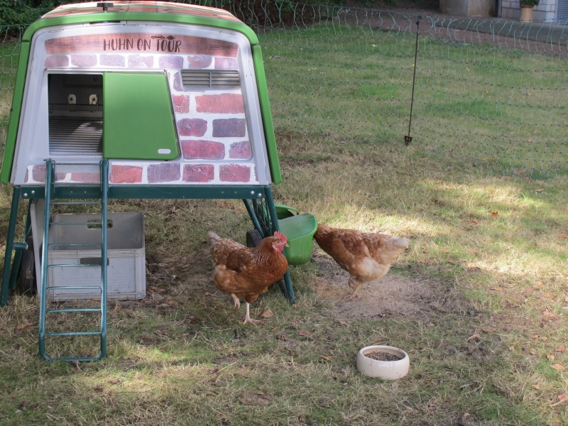 Auch in diesem Jahr dürfen wir 4 handzahme Legehennen in unserem Innenhof beherbergen. Ihren mobilen Stall mit Tränke, Futterspender und Zaun bringen sie mit. Wir freuen uns auf täglich frische Eier. Die Hühner können noch bis zum 30. Juni 2020 besucht werden.