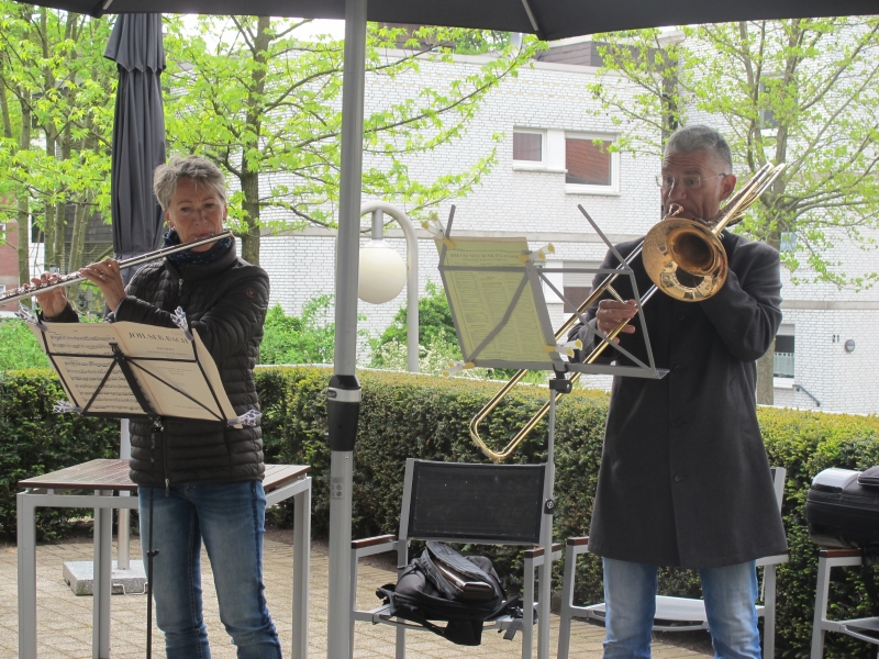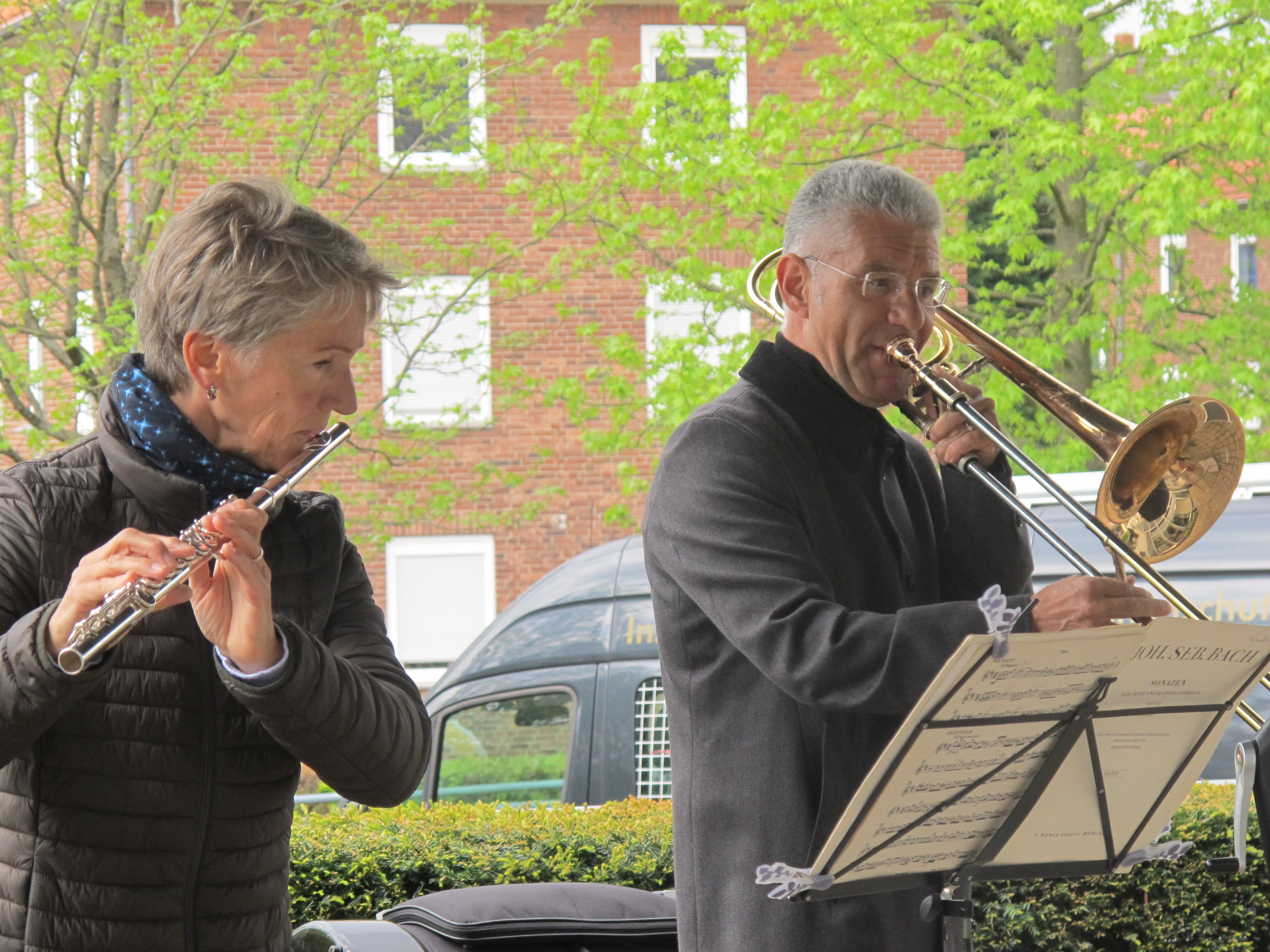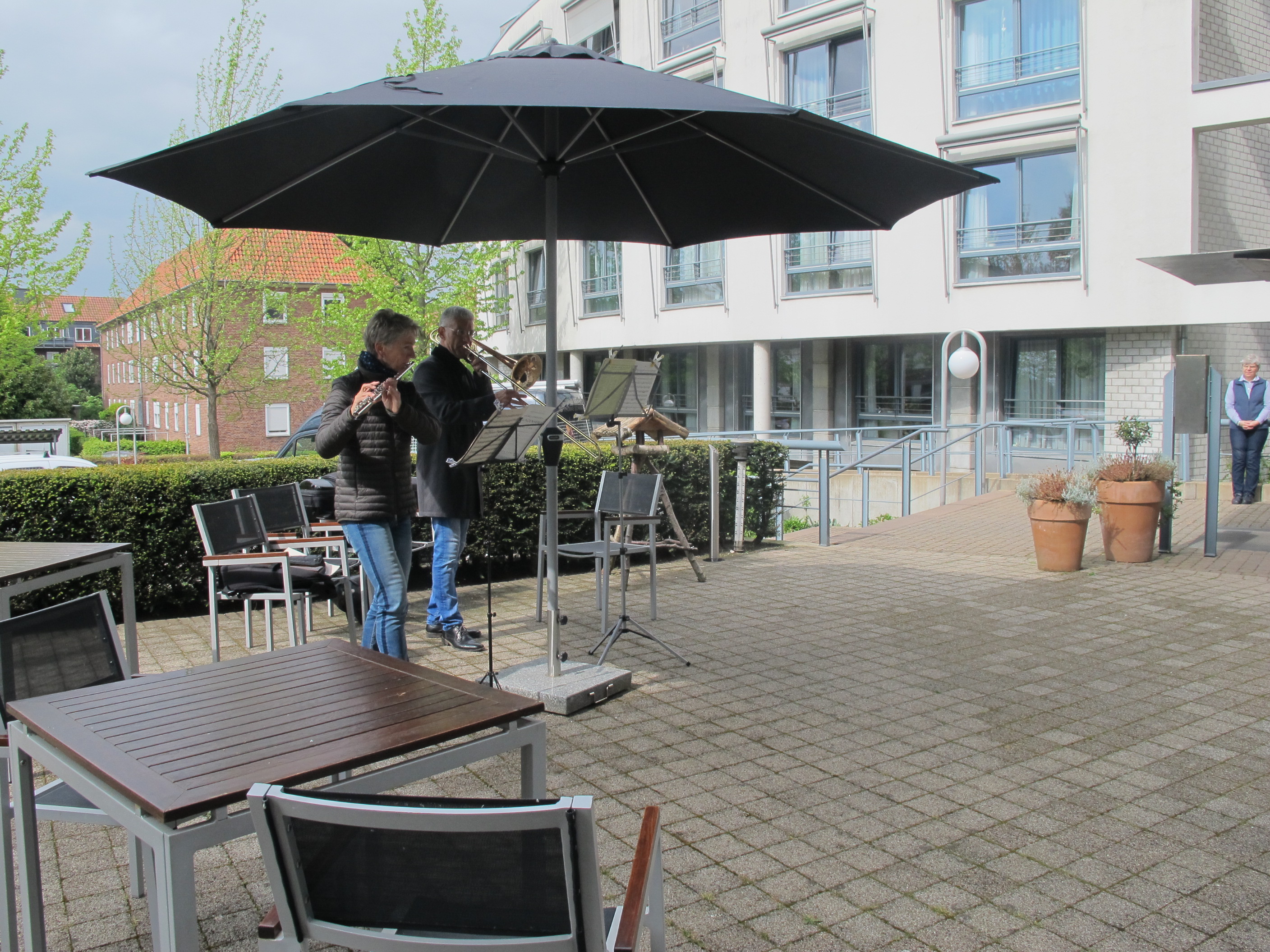 Mitglieder des Sinfonieorchesters Münsters erfüllten gestern unsere Terrasse mit Musik von J. S. Bach und G. C. Wagenseil. Friederike Wiechert-Schüle (Flöte) und Jochen Schüle (Posaune) sind seit vielen Jahren Mitglieder des Orchesters. In Zusammenarbeit mit der Caritas Münster möchten die Musiker mit kostenfreien Konzerten Einrichtungen der Altenhilfe unterstützen. Die Friedrichsburg sagt herzlichen Dank!