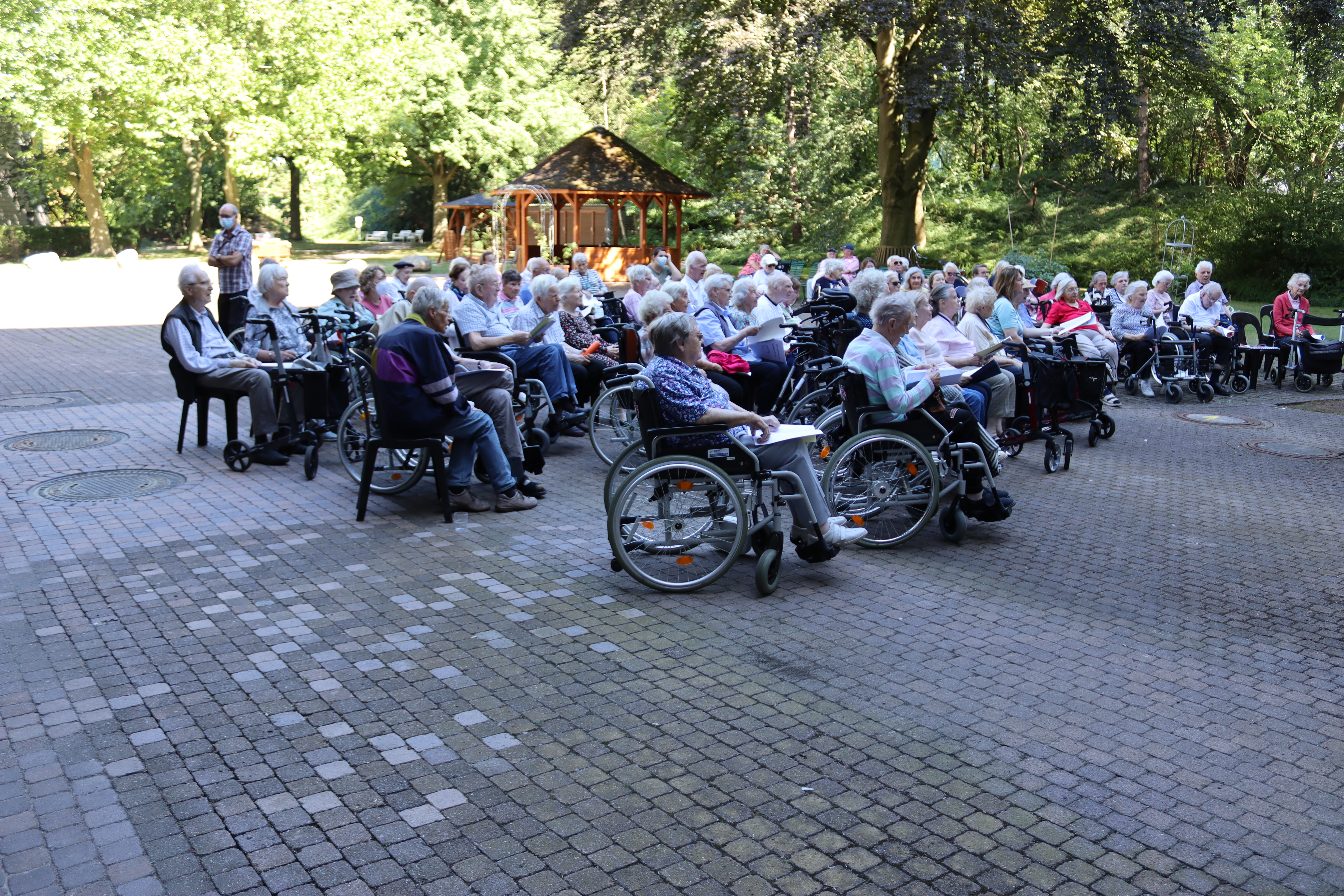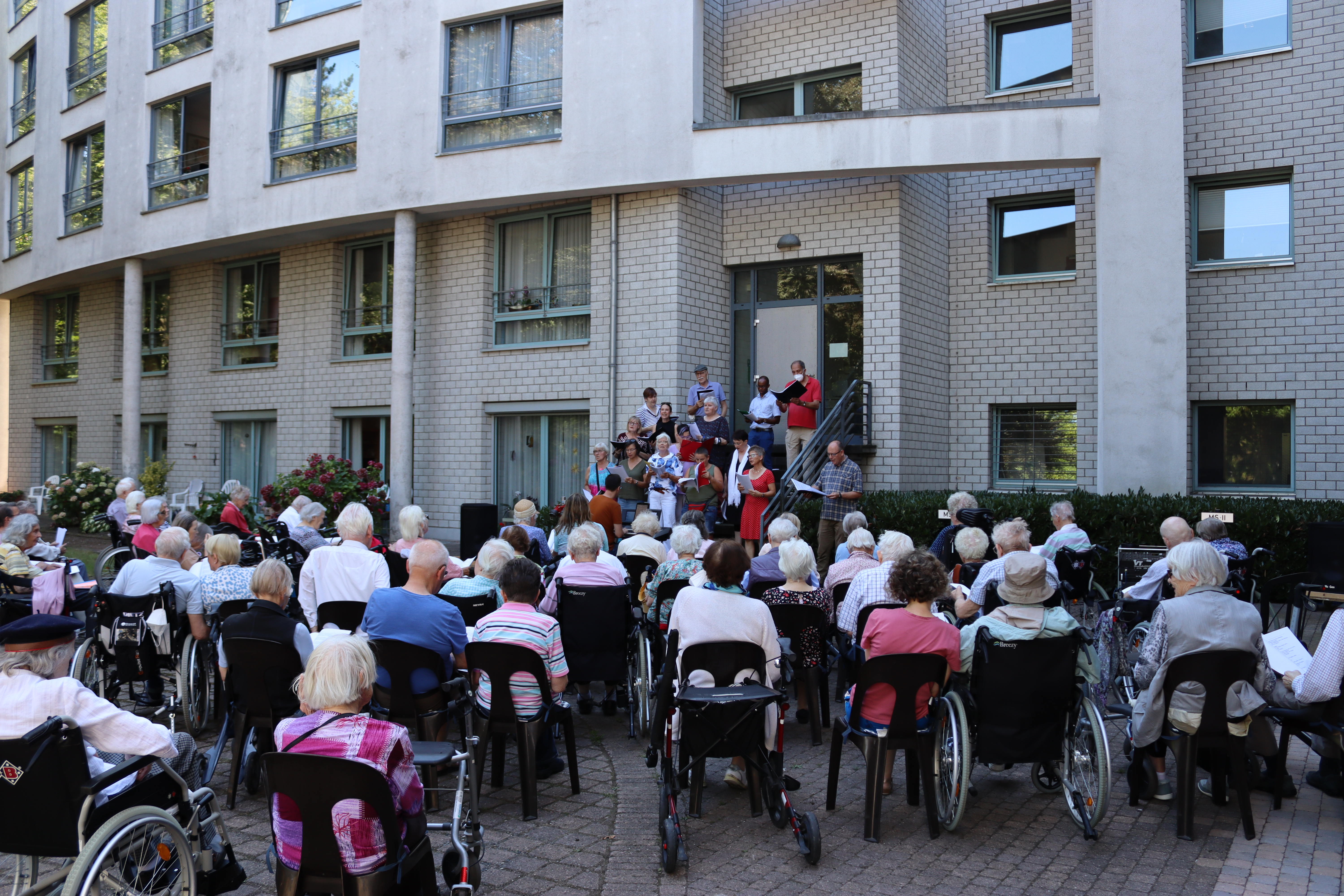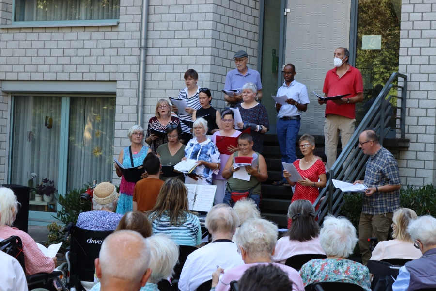 Am Mittwoch, 10.08.2022 freuten sich zahlreiche Bewohnerinnen und Bewohner über ein Konzert im Garten. Bei schönstem Sonnenschein sang der Chor Rückenwind unter der Leitung von Sven Leimann ein buntes Programm aus Schlagern und modernen Stücken. Bei einigen Liedern wie Lili Marleen oder Capri Fischer sangen alle begeistert mit. Wir bedanken uns ganz herzlich bei allen Chormitgliedern und bei Bruder Christoph Gerenkamp für die Vermittlung.