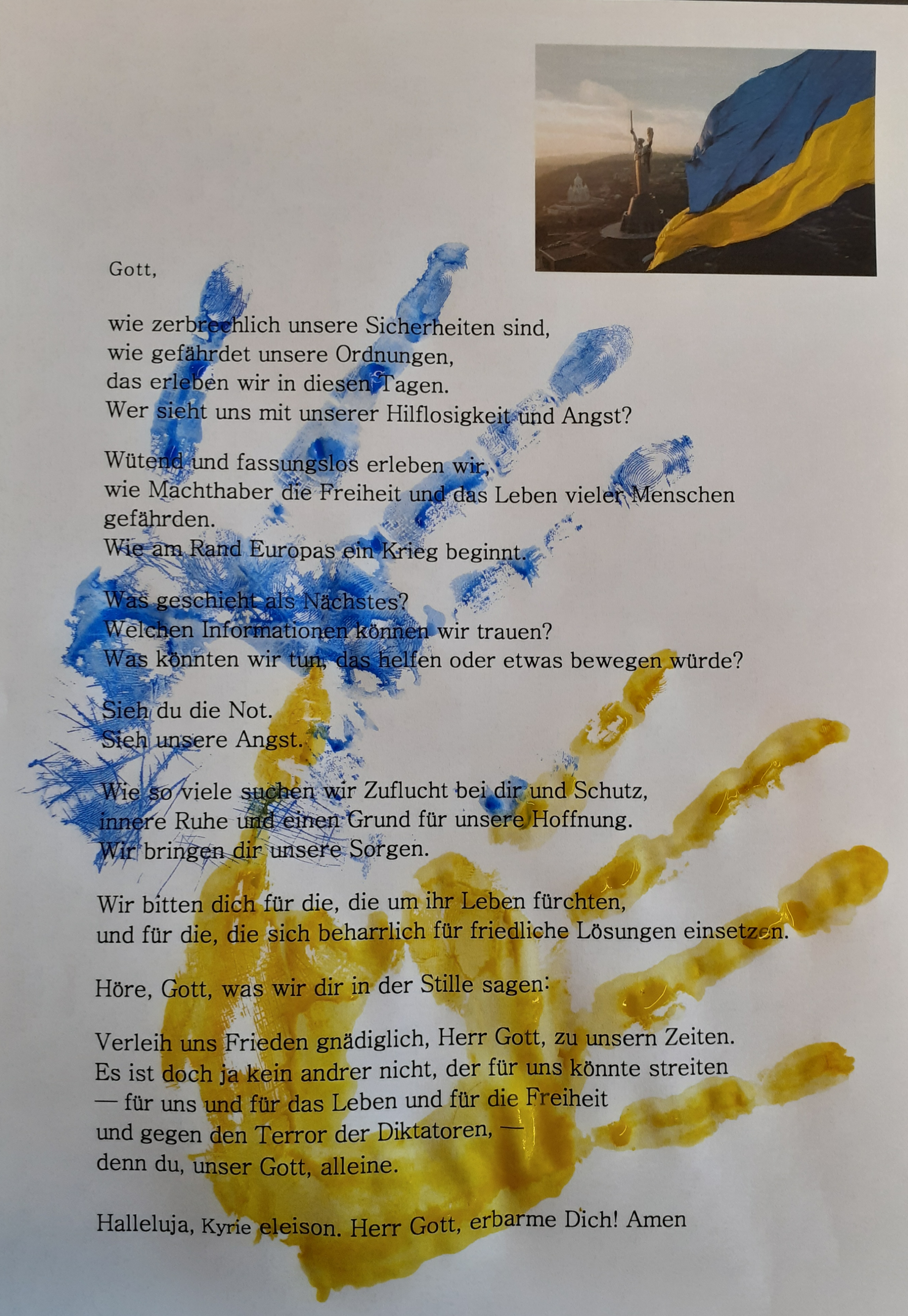 Auch wir sind bestürzt über den Krieg in der Ukraine, mitten in Europa. Unser Mitgefühl gilt allen Menschen, die leiden. Die Evangelische Kirche in Deutschland hat anlässlich der dramatischen Entwicklung ein Friedensgebet verfasst, das vielen gerade aus dem Herzen spricht. BewohnerInnen und MitarbeiterInnen im Altenheim Friedrichsburg beten für den Frieden. Sie wollen ein Zeichen setzen, das Krieg keinen Platz in unserer Welt haben darf.