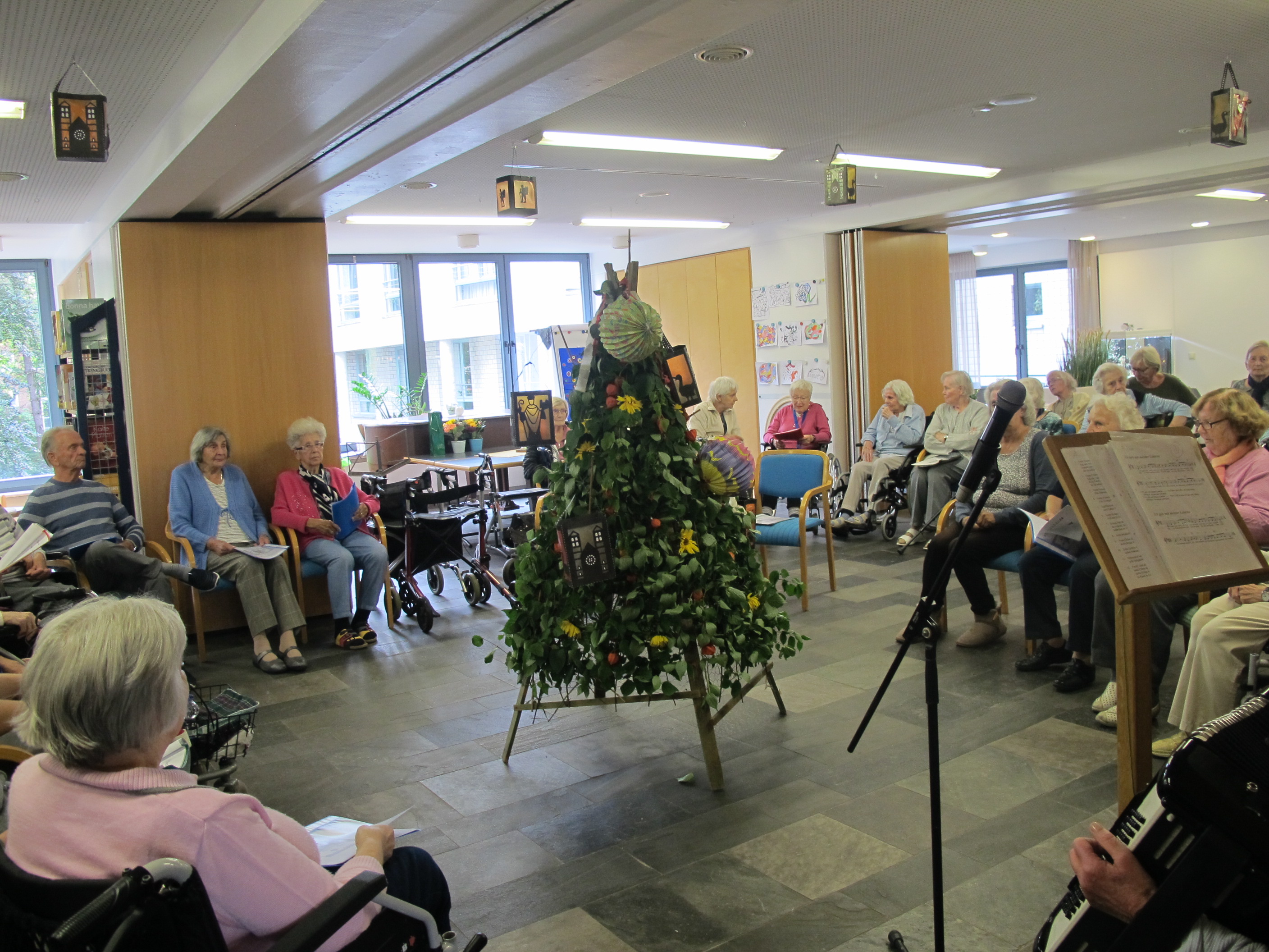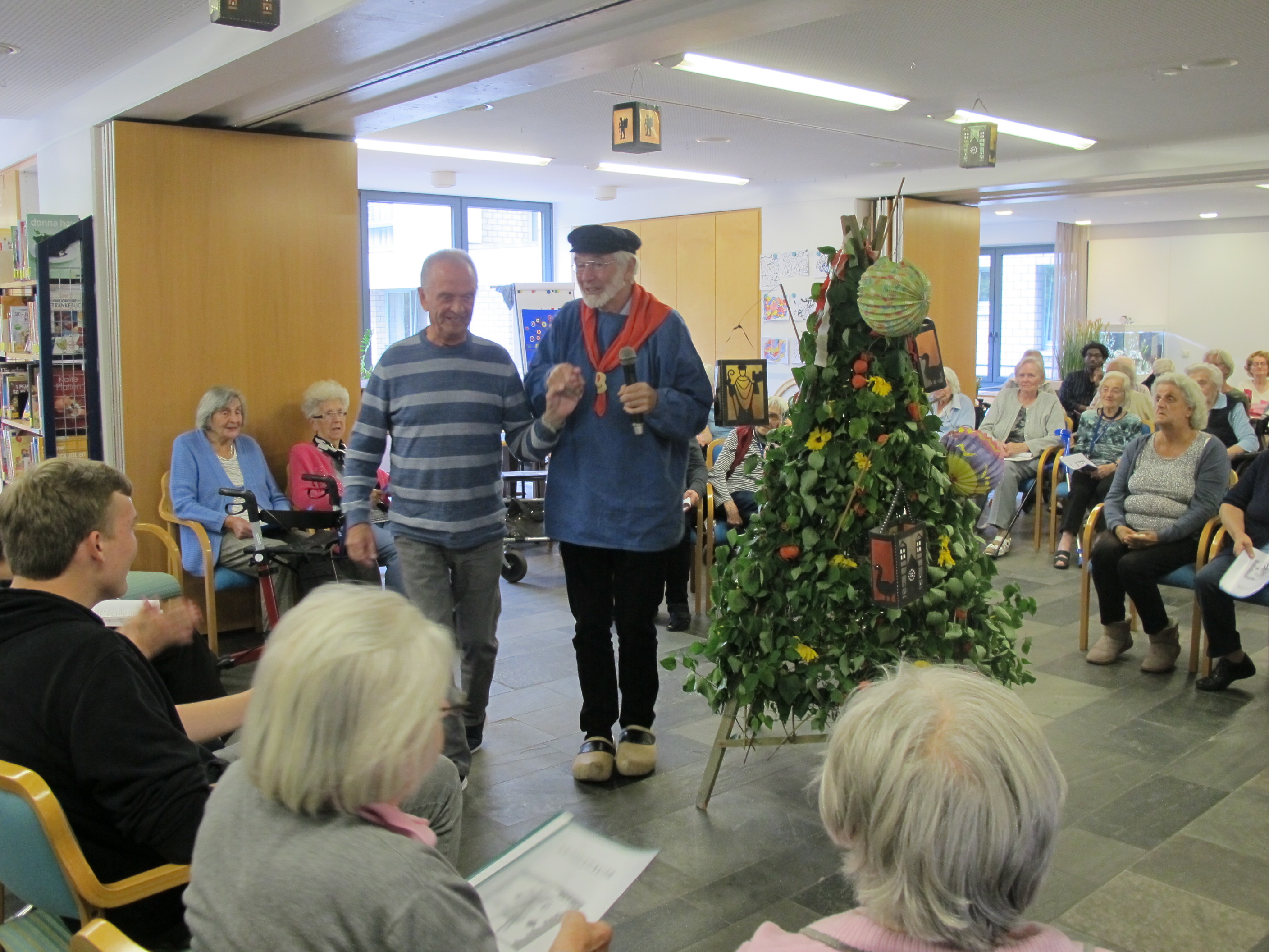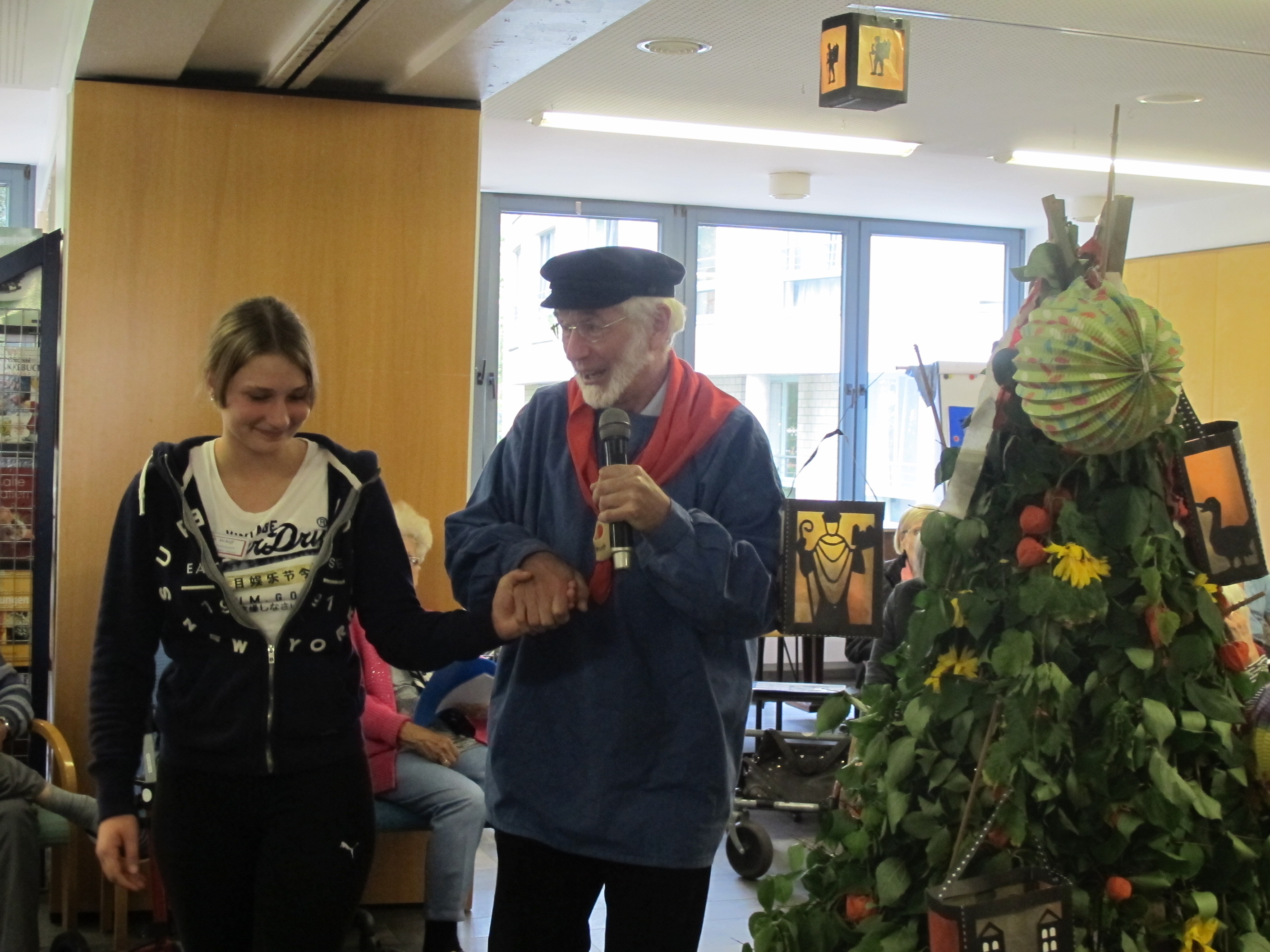 O Buer wat kost Dien Hei? Im Altenheim Friedrichsburg wurde diese überlieferte Tradition des Lambertusfestes am Dienstag, 17.09.2019 weitergeführt. Kinder kommt runter, Lambertus ist munter.... Statt Kindern folgten zahlreiche Senioren, Angehörige und Mitarbeiter dem Ruf. Die schön geschmückte Pyramide wurde mit selbst hergestellten Laternen bestückt. Für die musikalische Begleitung sorgten Helga Möseler mit dem Schifferklavier und Frau Ute Gron auf der Gitarre. Der Buer Helmut Baumeister nahm sich als Kind Dorothee Aschoff (FSJ). Weiter spielten die Senioren als Bäuerin Christa Batzill, Magd wurde Anneliese Wuntke, Knecht Egon Kuhl, Ruen Walter Paprotta und Pottlecker spielte Eleonore Bonenkamp. Abschließend verteilte der Buer gesundes Obst an Teilnehmer und ein Schnäpschen für den Heimweg. Mit dem Lied "kein Schöner Land" klang dann das Lambertusfest aus.