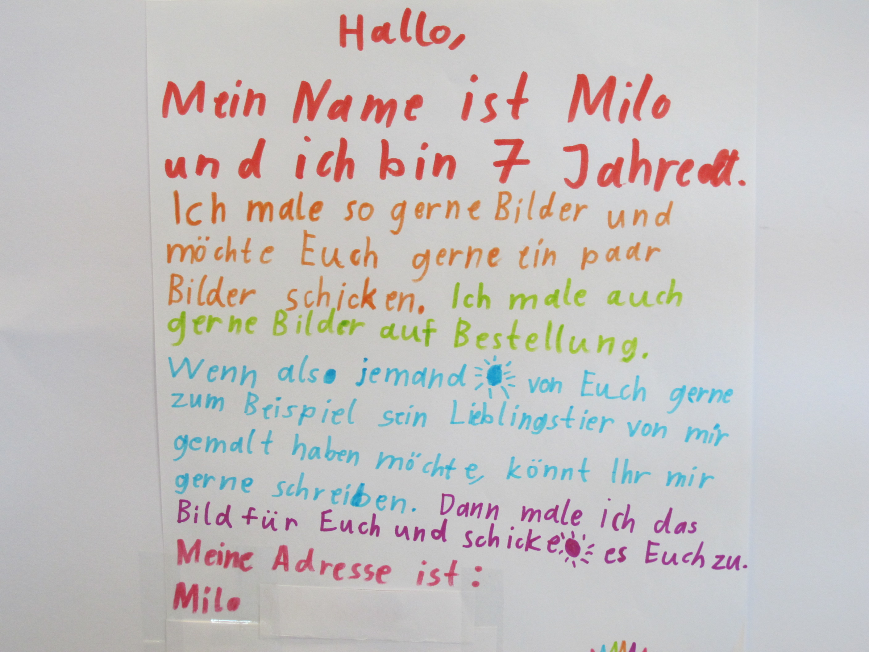 Heute erreichte uns liebe Post aus der Nachbarschaft. Der 7jährige Milo hat einige Bilder für die Bewohnerinnen und Bewohner gemalt. Mit seinem Hobby will er anderen eine Freude bereiten und hat sogar angeboten, für Bewohnerinnen und Bewohner Bilder auf Bestellung zu malen. Vielen herzlichen Dank!