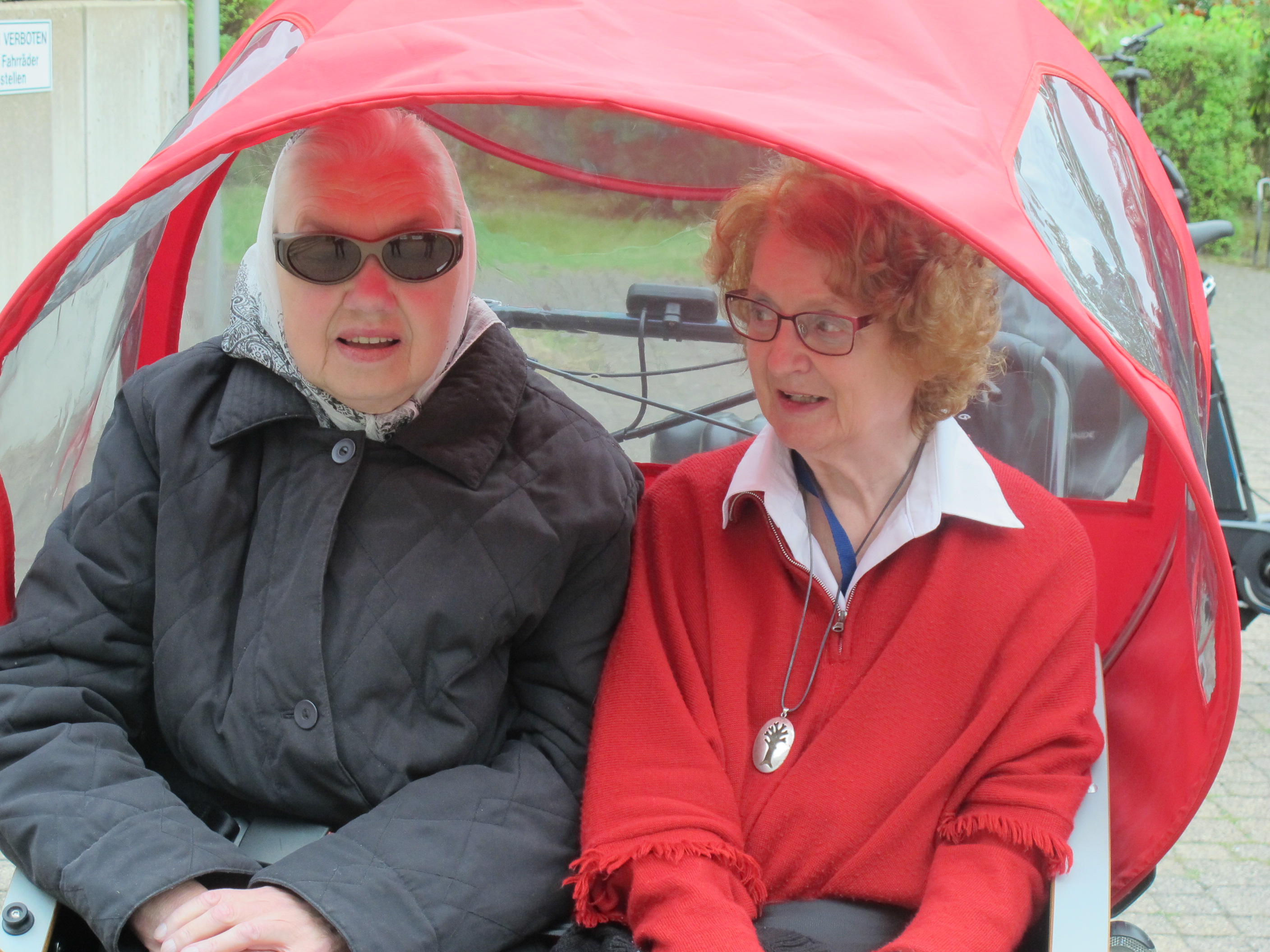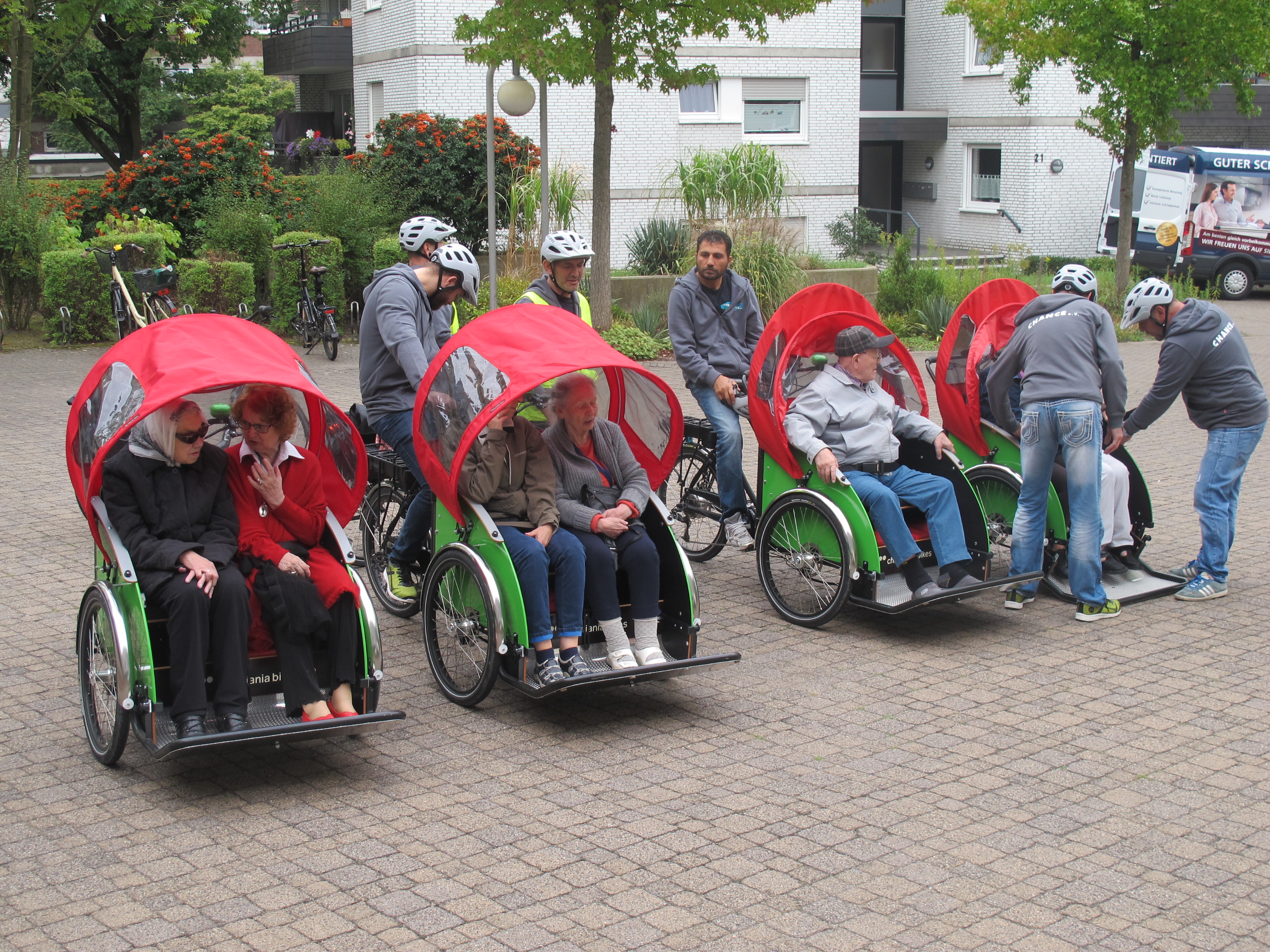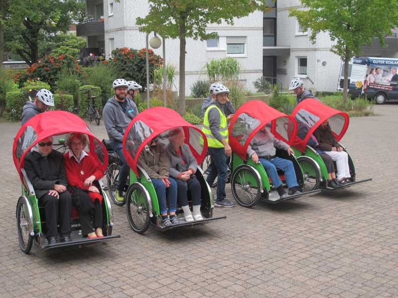 Im Rahmen des Projektes "Radeln ohne Alter" der Chance e.V. Münster fahren Bewohnerinnen und Bewohner regelmäßig mit den Fahrrad-Rikschas durch Münster. Die Begeisterung ist groß, wenn die Fahrräder über vertraute Wege wie den Promenadenring oder rund um den Aa-See touren. Erinnerungen an die eigene Fahrradzeit werden wach, frische Luft und Bewegung wecken die Lebensgeister. Das Projekt wird vom Jobcenter Münster und der Stiftung Hüffer gefördert.