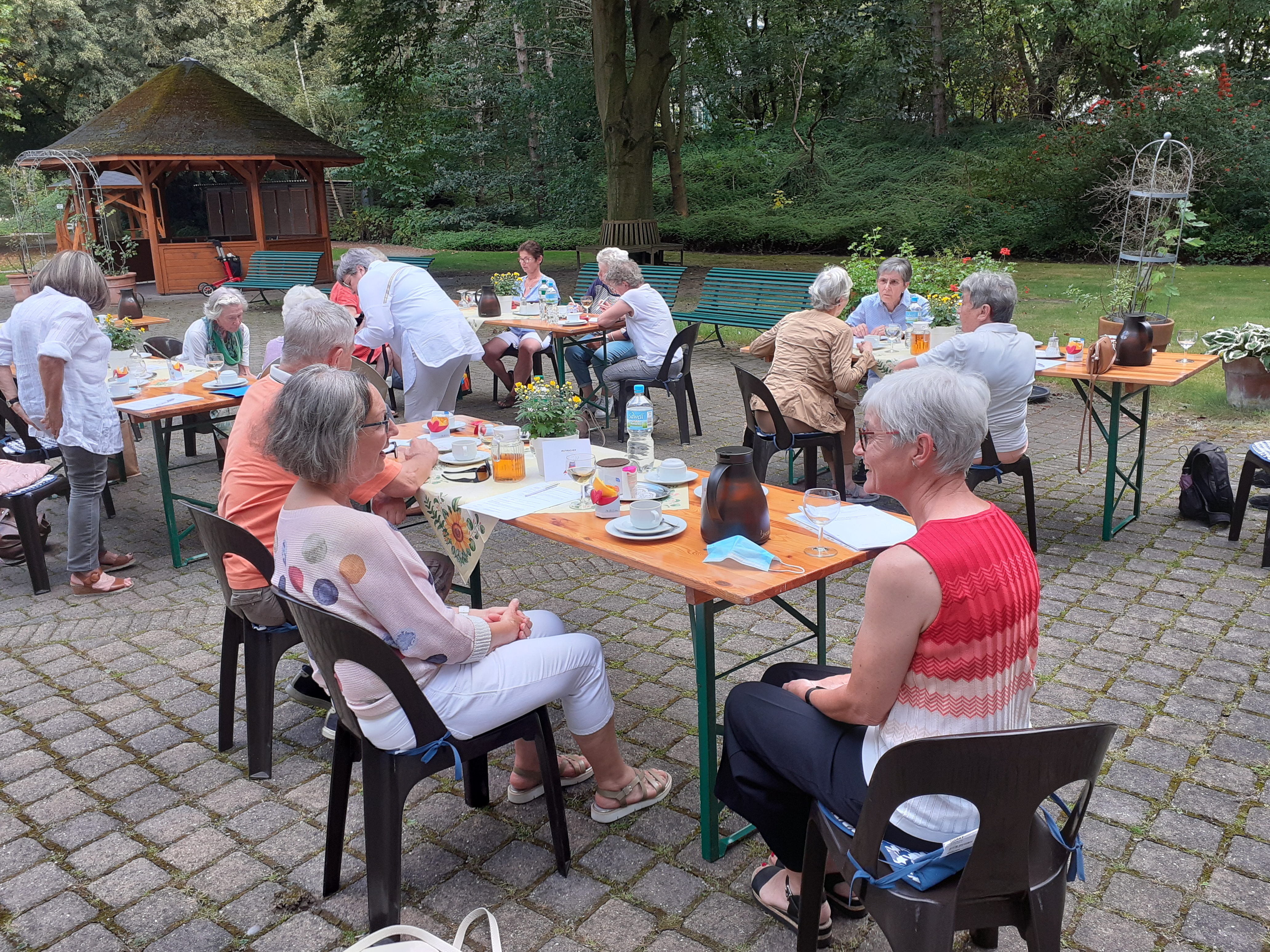 Am Donnerstag, den 9.09.2021 trafen sich die Ehrenamtlichen Mitarbeiter des Altenheims Friedrichsburg erstmalig seit der Corona Pandemie. Die Corona Pandemie stellt unser ganzes gesellschaftliches Leben vor eine Herausforderung. In dieser schwierigen Situation macht es Mut, dass Menschen ehrenamtlich bereit sind, sich gegenseitig zu helfen und zu unterstützen. Wir sind froh und dankbar für das Engagement in unserer Einrichtung. Frau Tiggemann (Leitung Sozialer Dienst) stellte das institutionelle Schutzkonzept zur Prävention gegen sexuelle Gewalt vor. Auch die ehrenamtlichen Mitarbeiter verpflichten sich, den Verhaltenskodex einzuhalten. Im gemeinsamen Gespräch konnten Fragen beantwortet werden. Ein sensibles aber wichtiges Thema. Kaffee und Kuchen rundeten den gelungenen Nachmittag bei schönstem Sonnenschein im Garten ab. Zum Abschluss informierte Frau Bönninghoff (Einrichtungsleitung) über Neues aus dem Haus.
