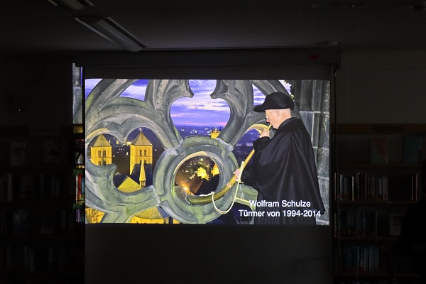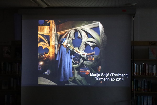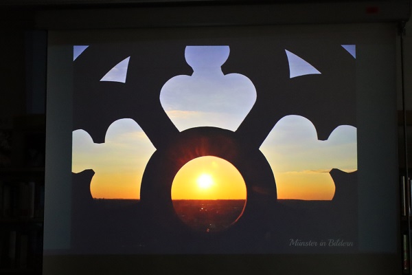 Am Montag besuchte uns Martje Thalmann, die erste weibliche Türmerin in Münster. Sie berichtete über die münsterische Tradition der Brandwache, die seit 1383 bekannt ist. Ihr täglicher Arbeitsweg führt sie 300 Stufen hinauf auf den Turm der Lambertikirche. Von 21.00 Uhr bis 0.00 Uhr bläst sie halbstündlich das Horn, in alle vier Himmelsrichtungen. Sommers wie Winters, ob es stürmt oder schneit, der Turm ist immer besetzt. Hoch über den Dächern von Münster erlebt Matje Thalmann tagtäglich wunderschöne Weitblicke über die Stadt. Besonders die Sonnenuntergänge sind immer sehr stimmungsvoll. Der besondere Arbeitspaltz setzt voraus, das man gut mit sich alleine sein Kann. Die Ruhe und Abgeschiedenheit in der Höhe bringen Abstand zum Alltag und Raum zum Nachdenken. Wie Martje Thalmann sagt: "Man muss diese Art der Arbeit schon lieben!"