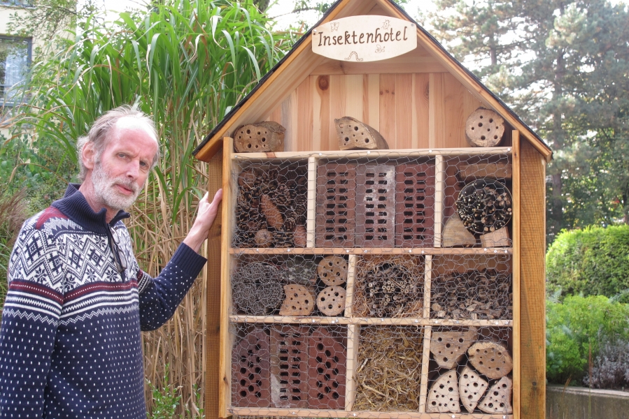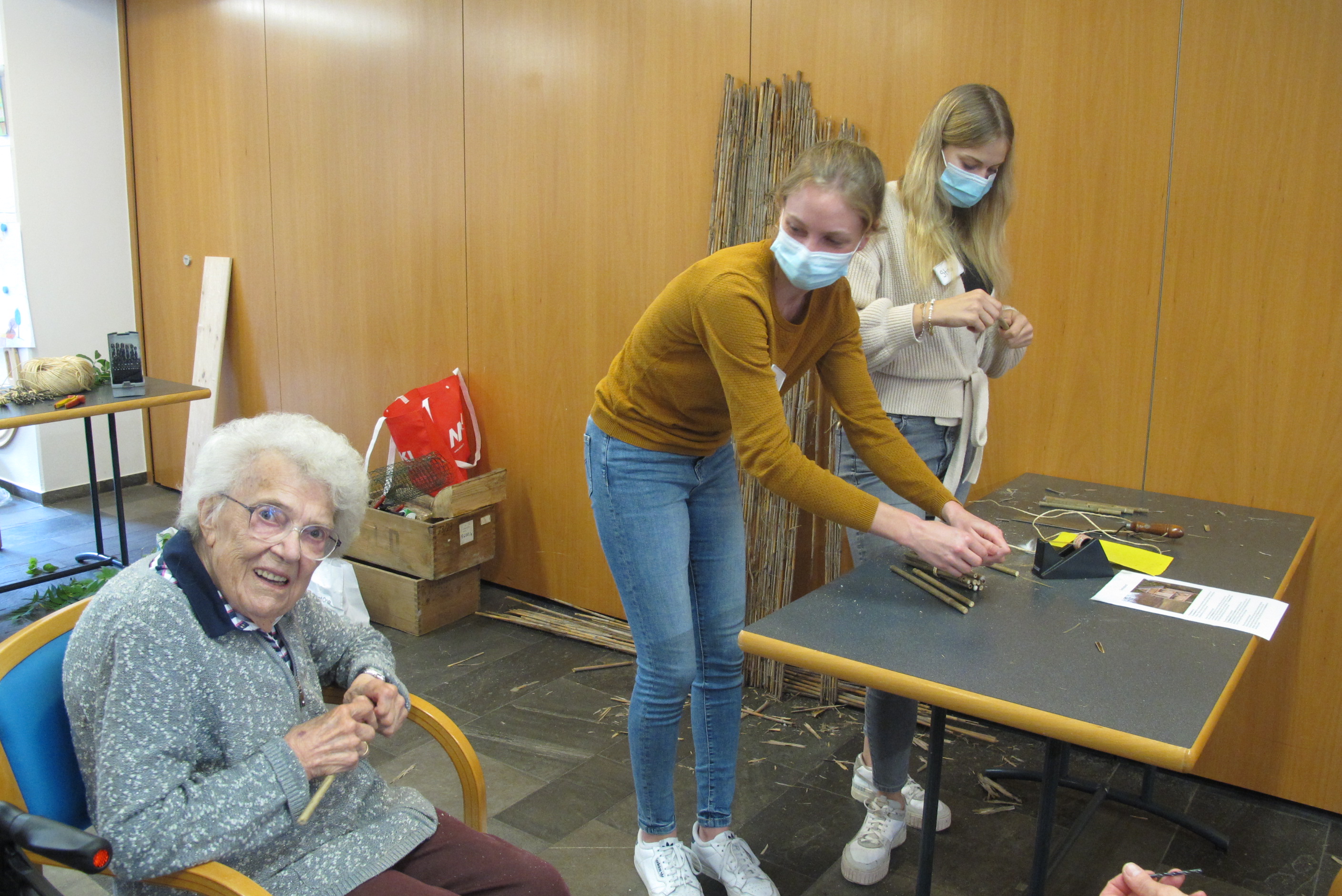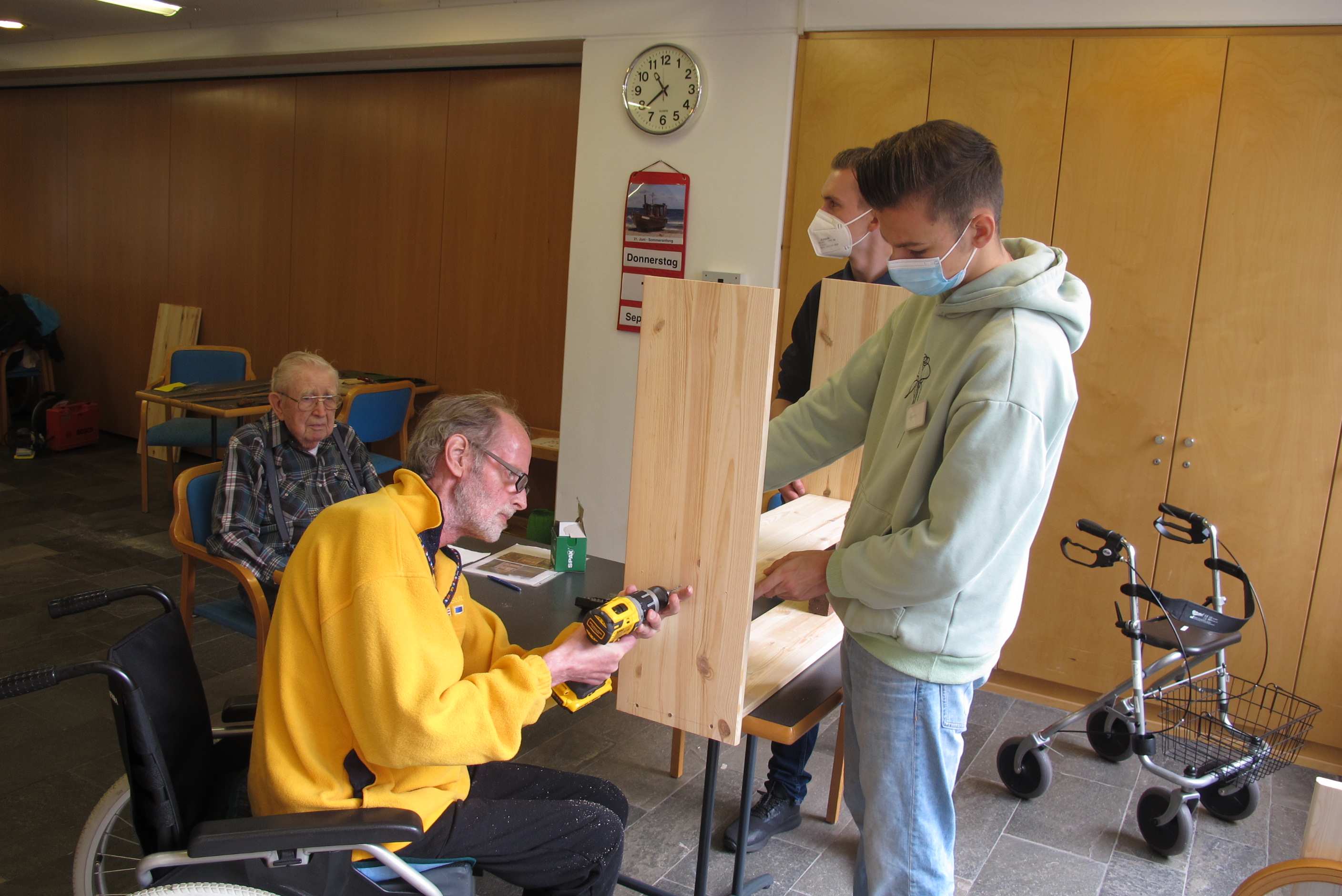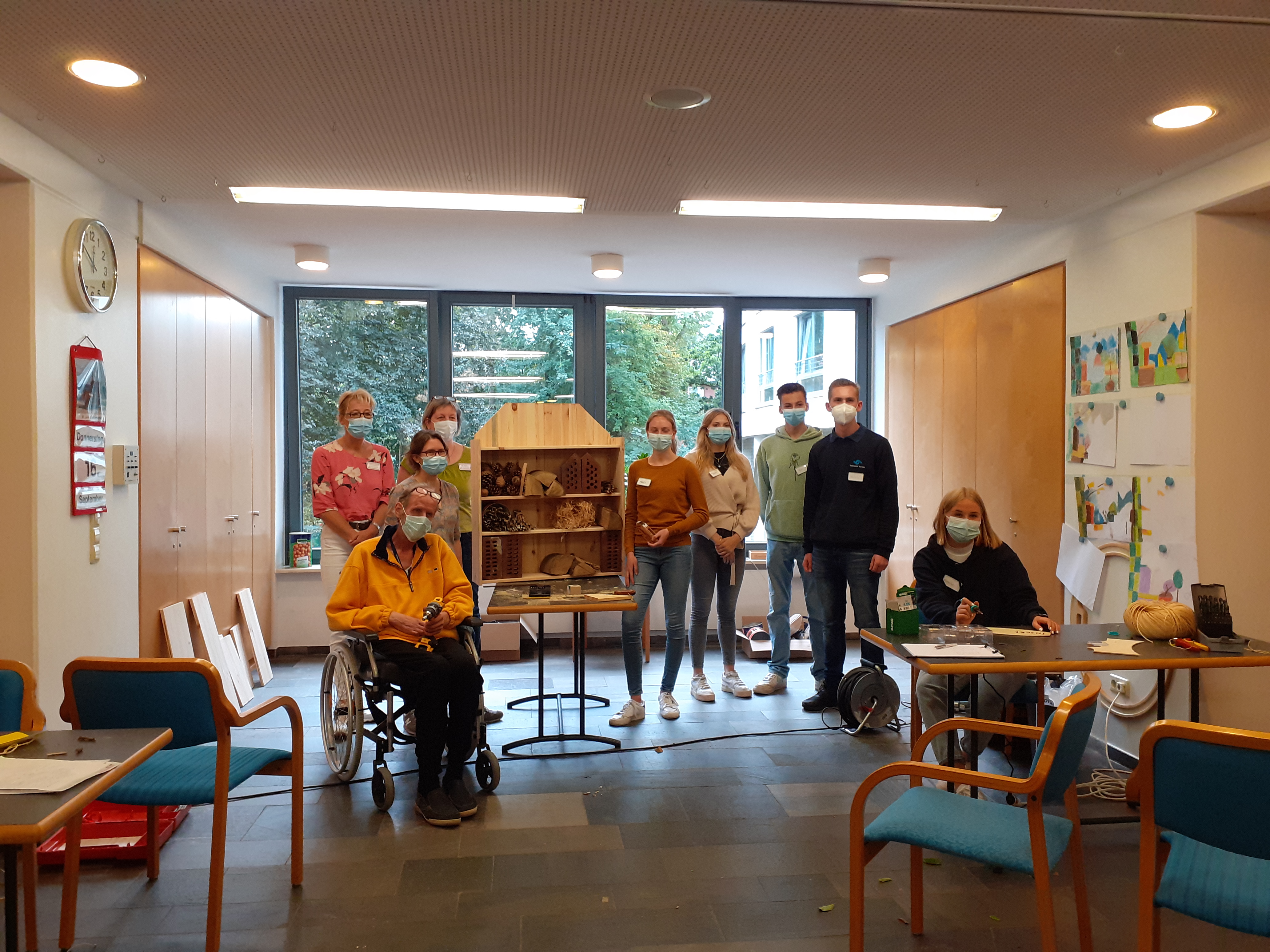 Im Rahmen des ZeitStifteTags der Freiwilligenagentur Münster besuchten uns am Donnerstag, den 16.09.2021 fünf Auszubildende der Stadtwerke Münster. Gemeinsam mit Bewohnern des Hauses wurde ausgemessen, gesägt und geschraubt, um ein Insektenhotel zu bauen.